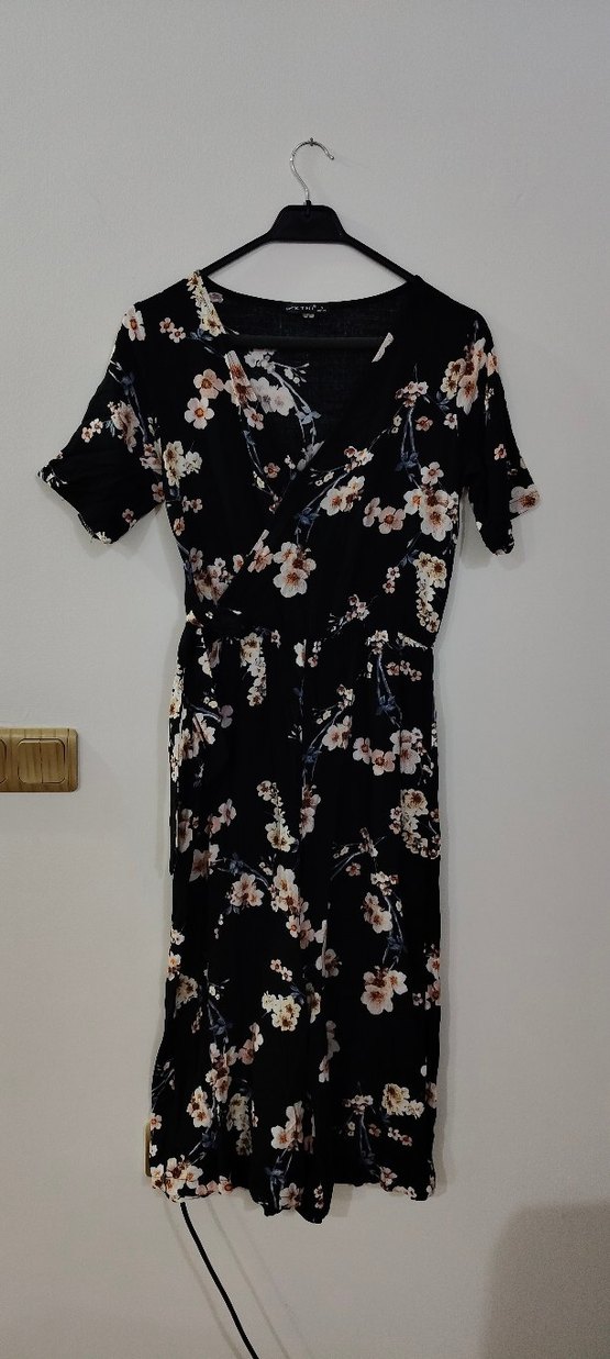 siyah zemin üzerine koyu çiçek deseniyle tasarlanmıştır. V yaka yapısına sahiptir. midi boy elbise tulum iki kol arası 43 cm boy omuzdan 110 cm'dir