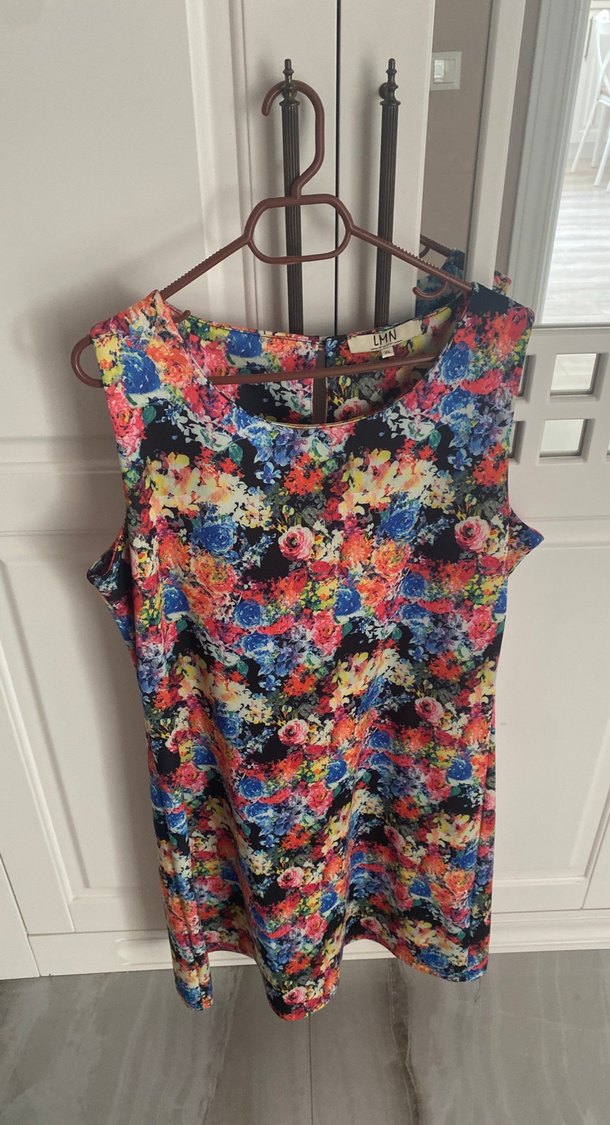 Çiçek desenli, kolsuz, salaş kesim midi elbise. Straplez yakası ve dökümlü detaylarıyla bohem tarzı yansıtıyor.