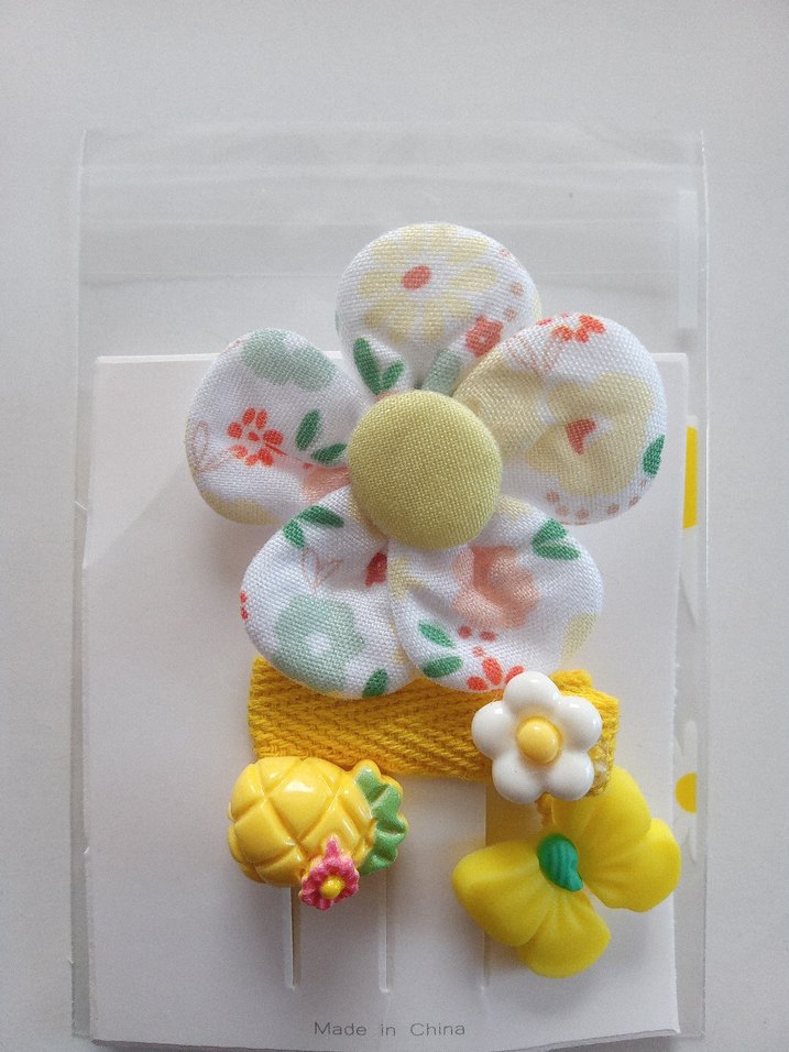 Çiçek desenli, bohem tarzda renkli elastik saç tokaları ve klipsler, çiçek ve ananas figürlü süslemelerle birlikte.