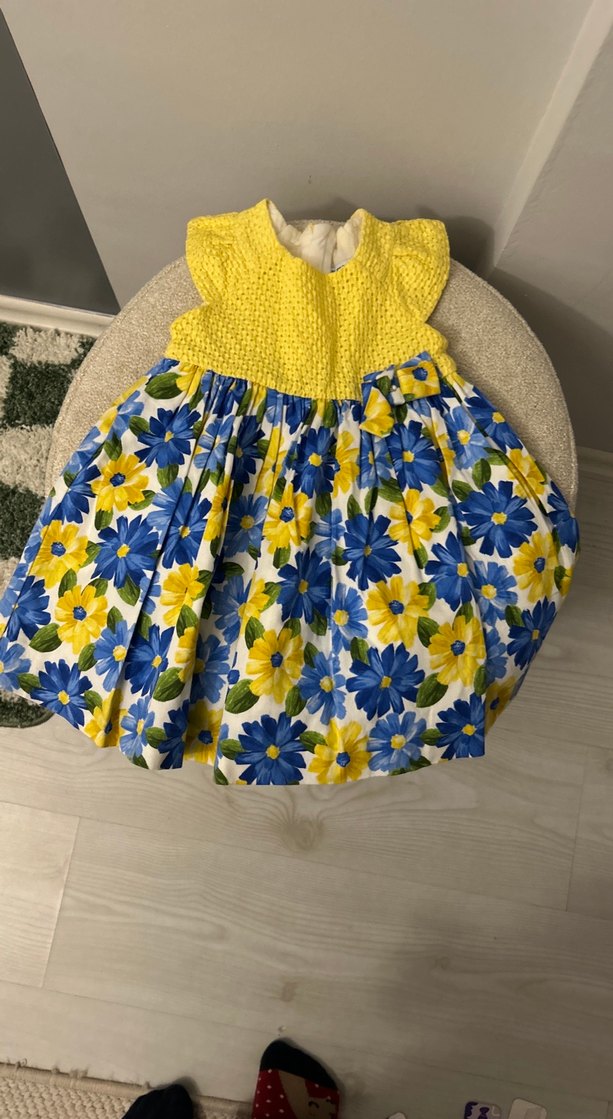 Fitted kesim, kolsuz sarı örme üst kısmı ve renkli çiçek desenli etek kısmı ile kız çocuk elbisesi. Bohem tarz, fırfır detayları ve straplez yaka içerir.