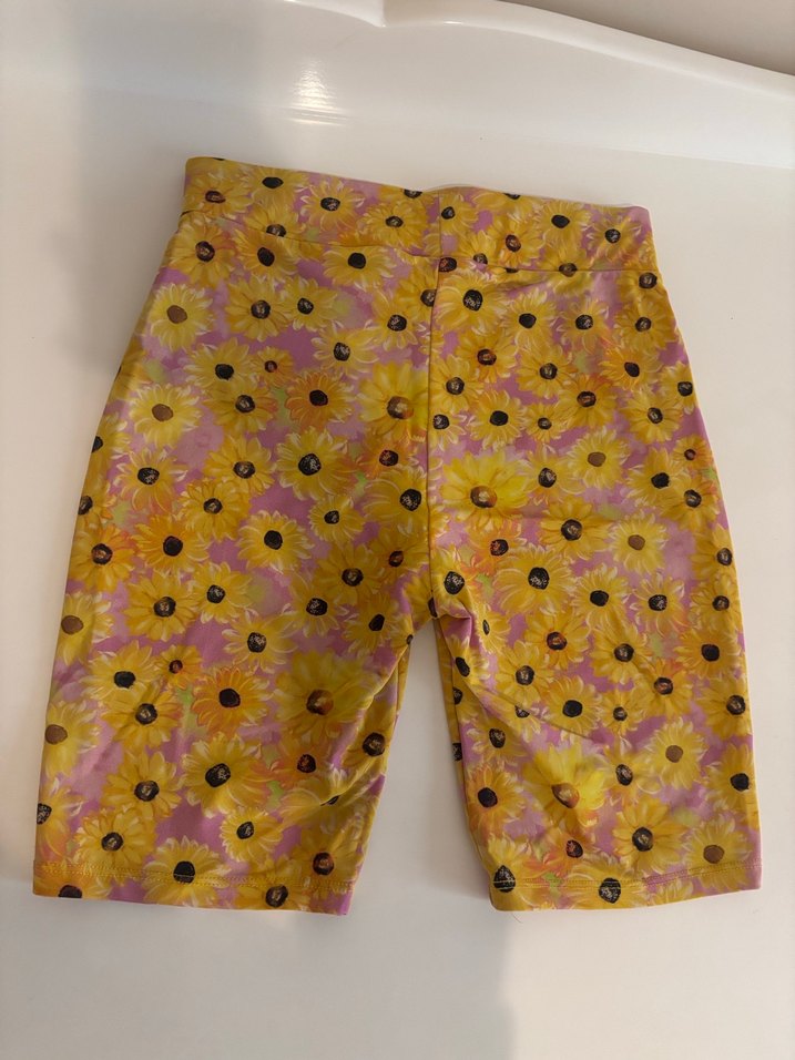 Bohem ve retro tarzı yansıtan, renkli çiçek desenli, bel kısmı tokalı sarı bisiklet şortu.