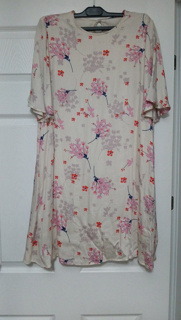 Pembe bohem saten elbise, kısa kollu, kayık yaka ve bol kesimdir. Yumuşak saten kumaş ve pastel çiçek desenine sahiptir, günlük kullanım için uygundur.