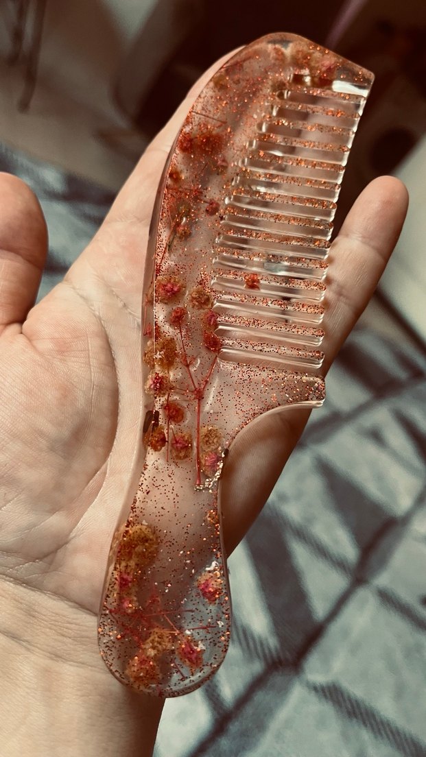 Bu şeffaf saç tarağı, içinde kurutulmuş çiçekler ve simler barındırır, hem dekoratif hem de işlevsel bir tarama aracıdır. EPOXİ EL YAPIMI TARAK