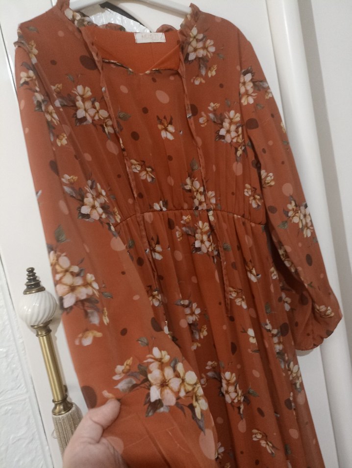 Kahverengi, uzun, bol kesim, V yaka ve uzun kollu elbise. Çiçek desenli ve fırfırlı, yumuşak sentetik kumaştan yapılmıştır.