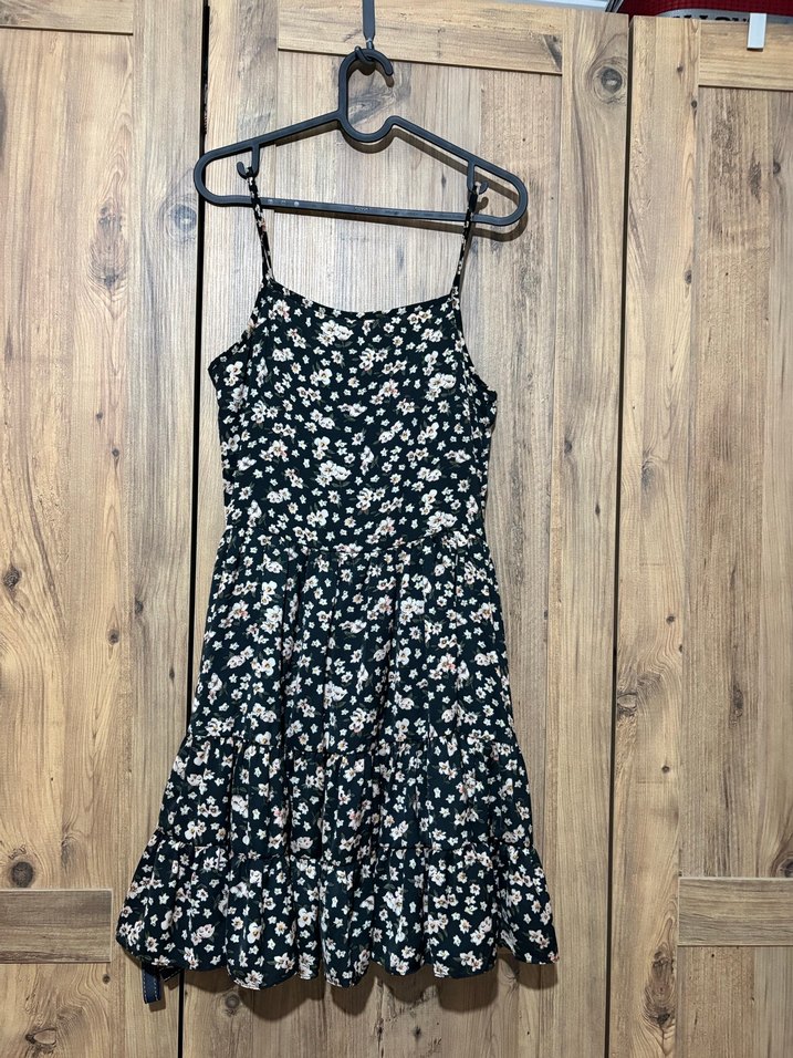 Çiçek desenli, askılı ve straplez yakalı, volan detaylı. Üst bedeni biraz dar bir kalıp, iki koltuk altı arası 40 cm. Askı boyu ayarlanabilir, elbisenin boyu 80-85 cm kadar askı boyuna göre.