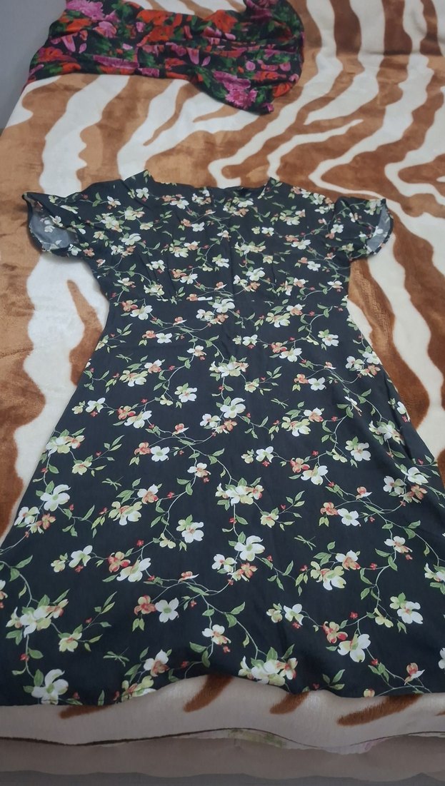 Uzun, bol kesim siyah elbise, çiçek desenli ve kısa kolludur. detaylara sahiptir, bohem tarzındadır.
