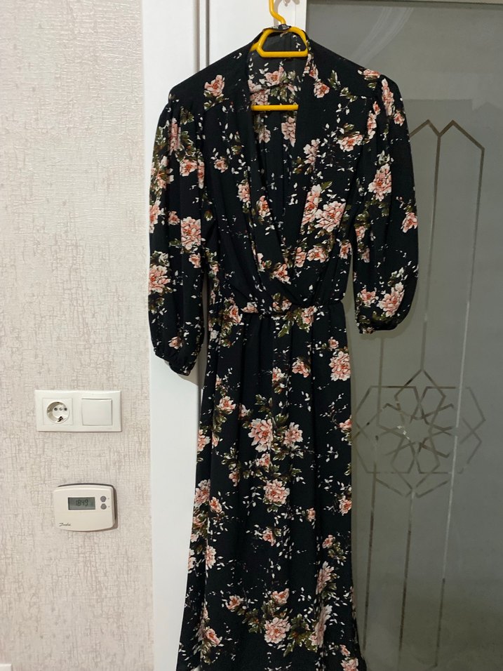 Çiçek desenli siyah uzun kadın elbisesi, bol kesim ve askılı kollara sahip, bohem Paris tarzını yansıtıyor.