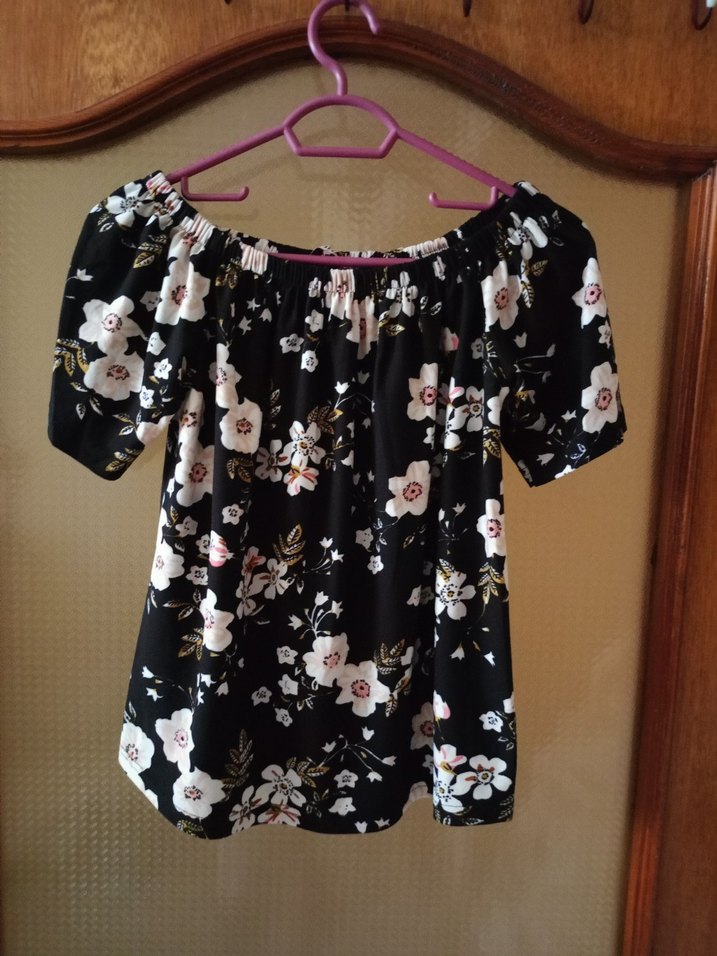 Çiçek desenli, kısa kollu, kayık yaka, bol kesim siyah bluz. Sentetik kumaştan, düğmeli detaylı, bohem tarzda.