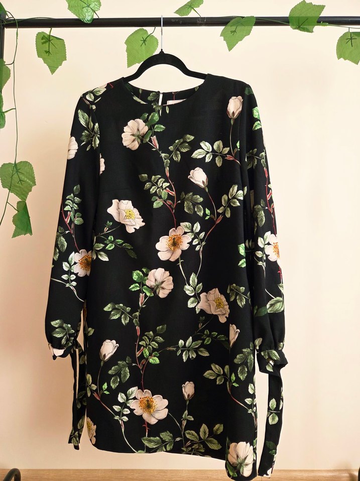Uzun kollu, yuvarlak yaka, çiçek desenli ve drapeli siyah, bol kesim. Romantik akşamlar için bohem tarzda ideal. defosu yok. #hm #elbise