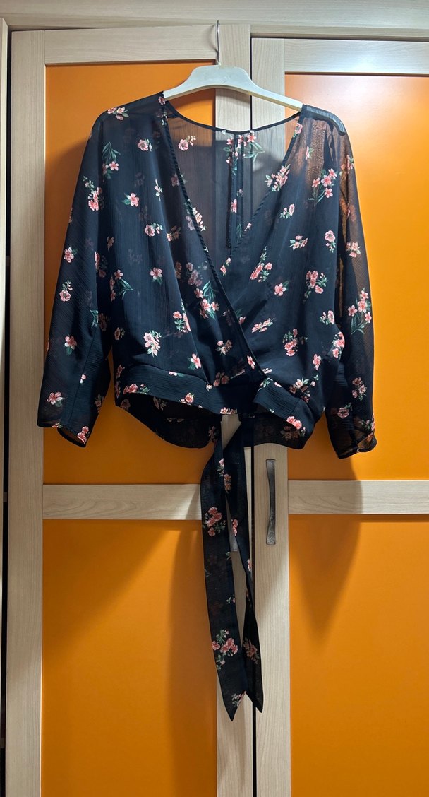Siyah, çiçek desenli, drapeli ve halter yaka bluz. Rahat kesim, ince askılı ve yumuşak sentetik kumaştan, günlük kullanıma uygundur.