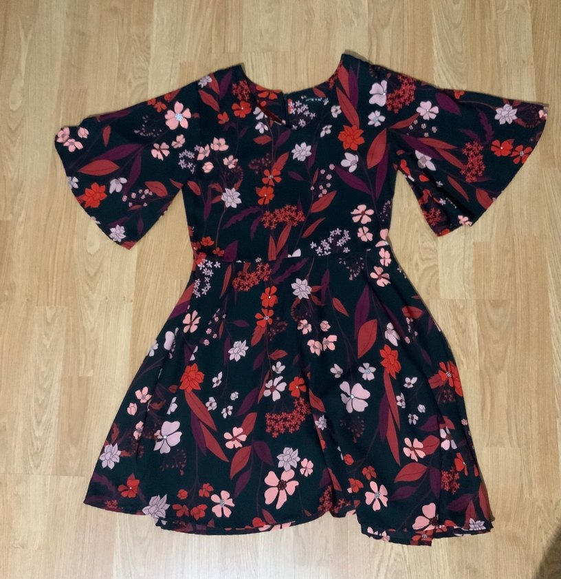 Kısa kollu, V yaka, bol kesim elbise. Koyu çiçek desenli, pileli detaylı, yumuşak kumaştan. L diyor ama M de giyer.