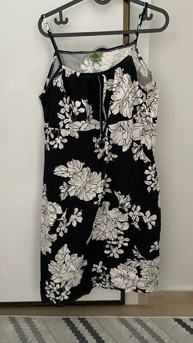 Siyah zemin üzerinde beyaz çiçek desenli, askılı ve Midi boy ve vücuda oturan kesim ile rahatlık sağlar