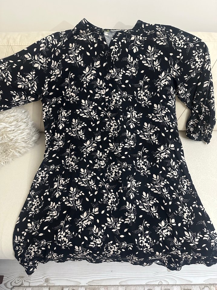 Pamuk kumaştan, uzun kollu, V yaka ve düğmeli siyah hamile tunik. Bohem çiçek desenli, rahat ve bol kesim, günlük kullanıma uygun.