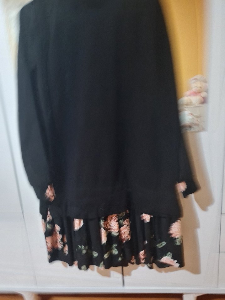 Siyah renkte, çiçek desenli ve volan detaylı, bol kesim uzun hamile eteği. Sentetik kumaştan, günlük sokak stili için uygun.