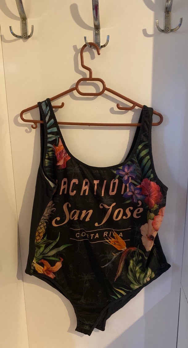 Siyah, çiçek desenli, kolsuz kadın mayo. Velcro detaylı, bol kesim ve midi boyda, günlük kullanıma uygun.