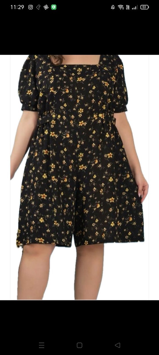 Siyah kısa tulum, bol kesim, kayık yaka ve kısa kollu. Çiçek deseni ve düğme detayları ile sentetik kumaştan, günlük kullanıma uygun. viskon kumaş
