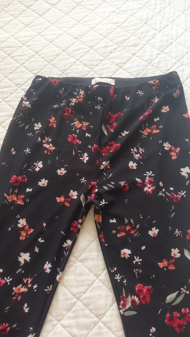 Düğmeli, çiçek desenli siyah kadın pantolon. Sentetik kumaştan, rahat ve trend sokak stili için uygun.