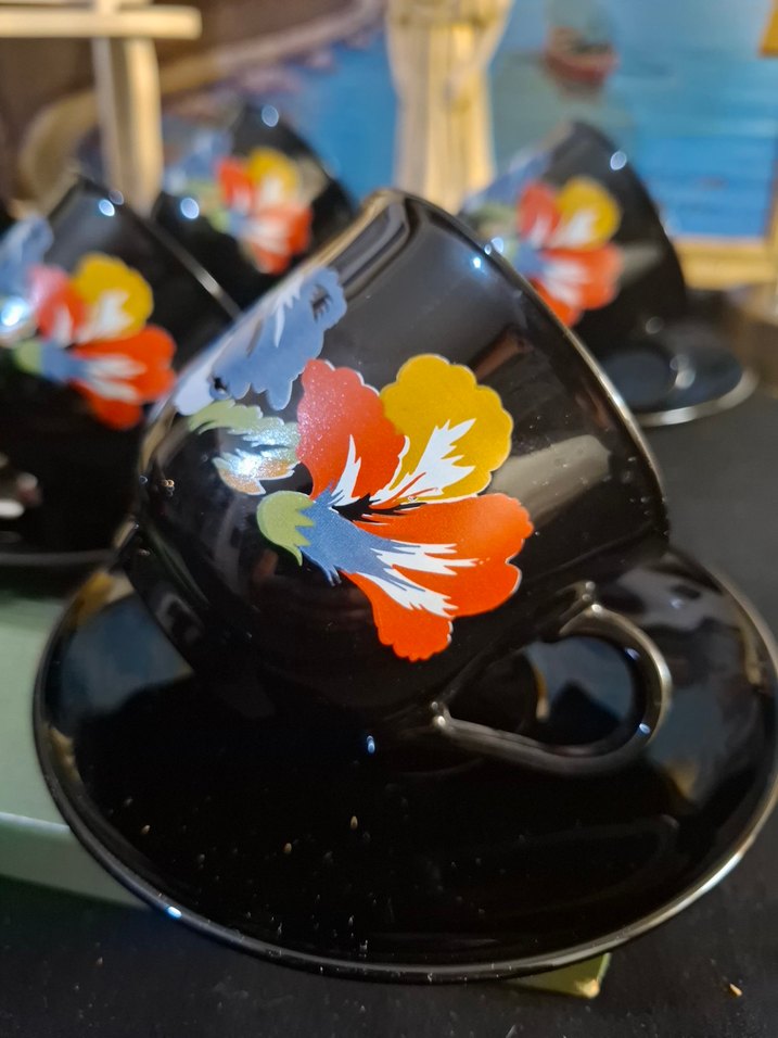 Canlı renklerde çiçek desenli siyah kahve fincanı seti, her fincanda desen bulunur ve uyumlu tabaklarla birlikte gelir. ☕ Fransız arcapol 6 adet çay fincanı sorunsuz takım halinde satılık
