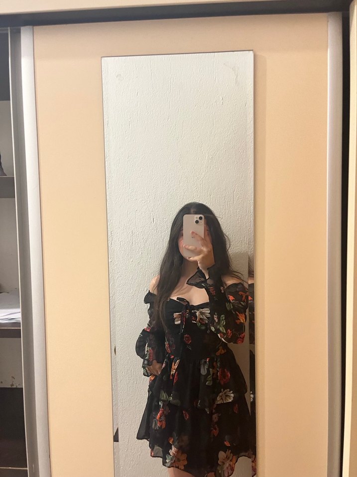 Çiçek Desenli Siyah Katlı Mini Elbise