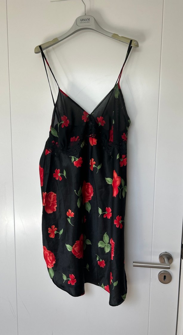 İnce askılı, gevşek kesim midi gecelik ve sabahlik; . Siyah zemin üzerine kırmızı ve yeşil çiçek desenleriyle vintage gotik tarzı yansıtıyor. Amerikadan alinmistir.