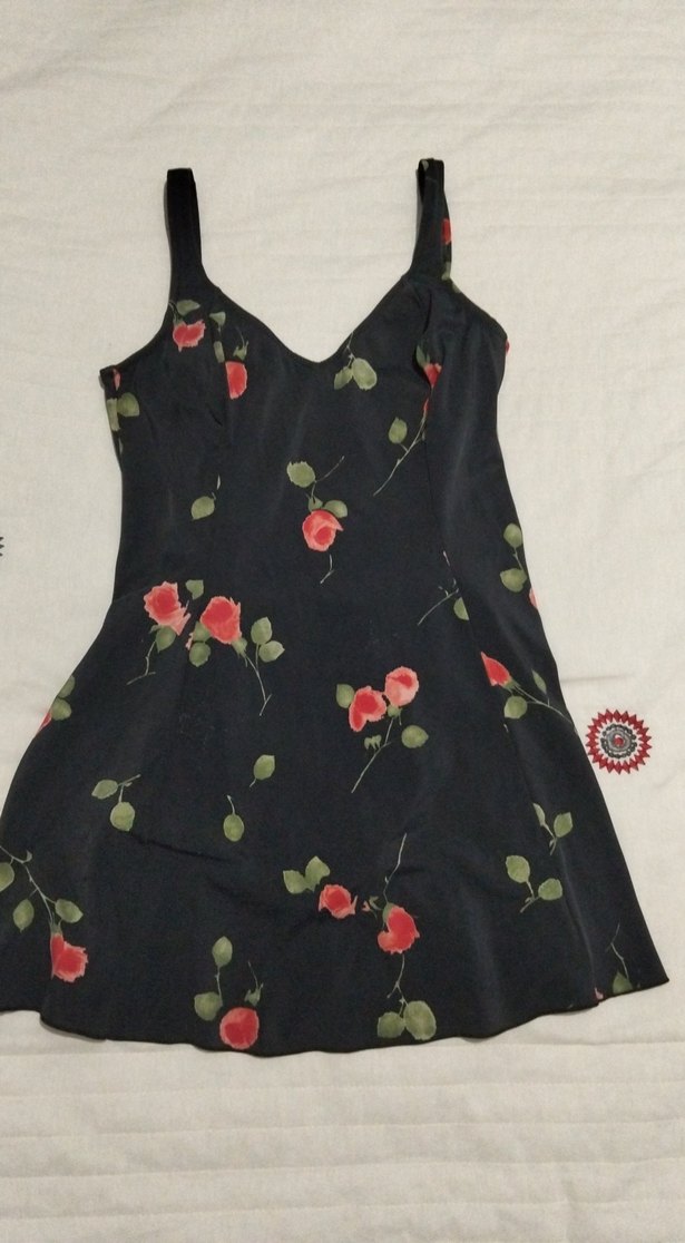 Siyah çiçek desenli, V yakalı, kolsuz ve midi uzunlukta, vücuda oturan sentetik kumaştan mayo. Fırfır detaylıdır, etekli mayo kaliteli az bi yıpranması var kullanılmayacam durumda değil yırtık yada hasar yok