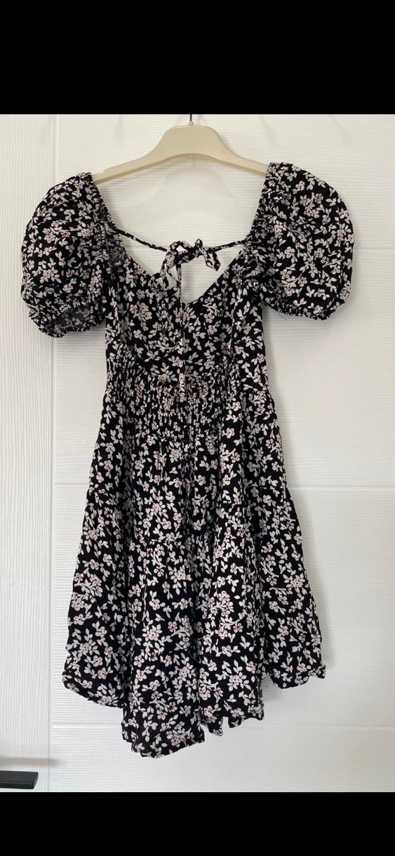 Siyah midi elbise, bol kesim ve askılı kollara sahiptir. V yaka ve fırfır detaylarıyla çiçek desenli, bohem tarzda romantik gecelere uygundur.