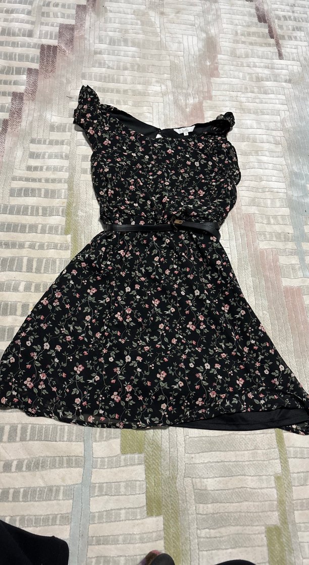 Bu oturan midi elbise, askısız yakası ve koyu renk üzerinde çiçek desenine sahiptir. Belde kemer bulunur, romantik akşamlar için uygundur. Kemer çıkabilir