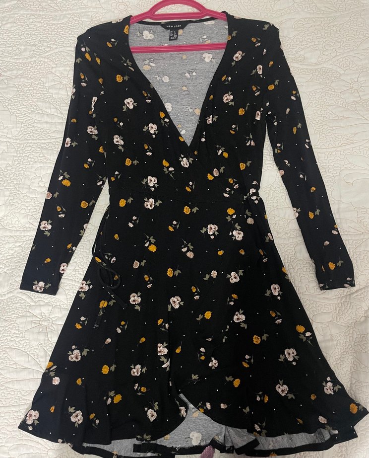 Uzun kollu, V yaka ve çiçek desenli siyah midi elbise, düğme detaylı ve vücuda oturan kesime sahip, yumuşak sentetik kumaştan üretilmiştir.