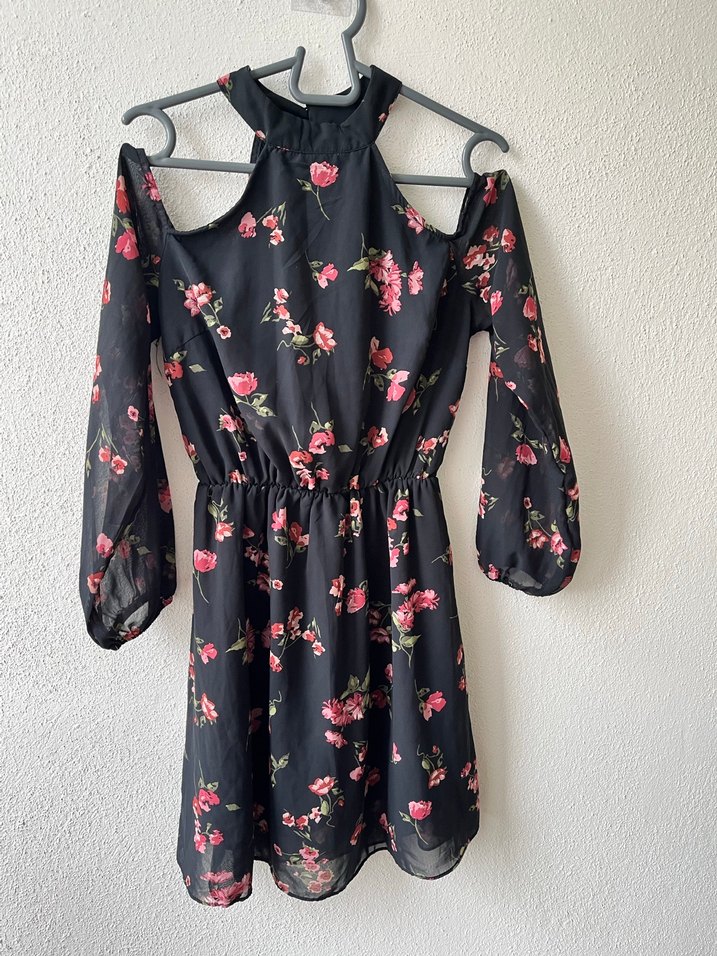Siyah çiçek desenli midi elbise, straplez ve dökümlü kesimiyle rahat bir görünüm sunar. Romantik akşamlar için uygundur.