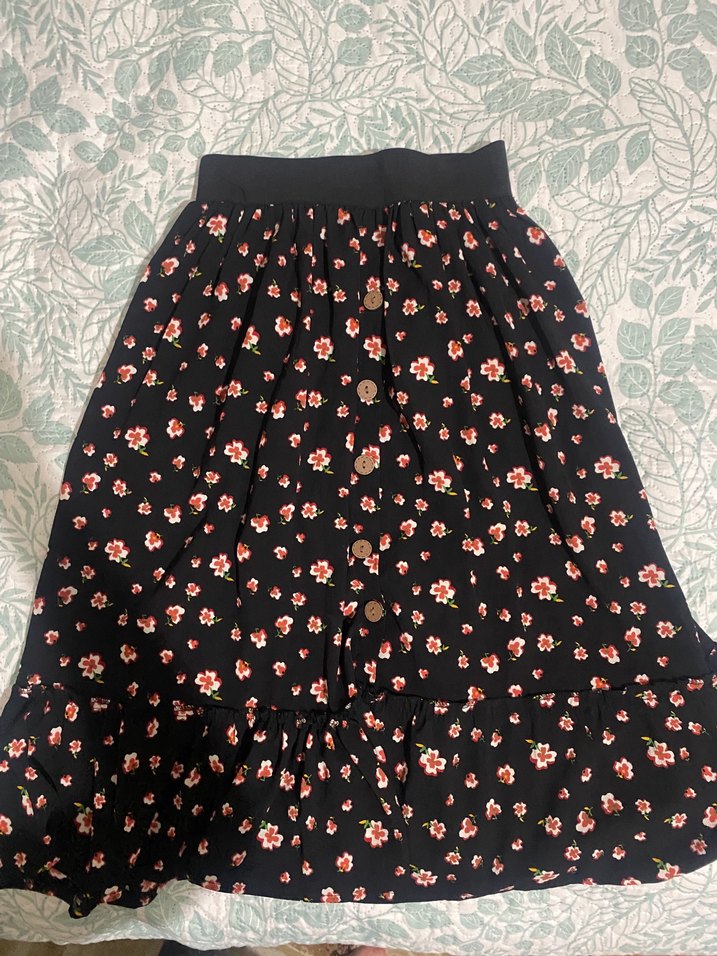 Çiçek desenli, düğmeli siyah midi hamile eteği, bol kesim ve fırfır detaylı. Yumuşak sentetik kumaştan, bohem tarz için uygun.