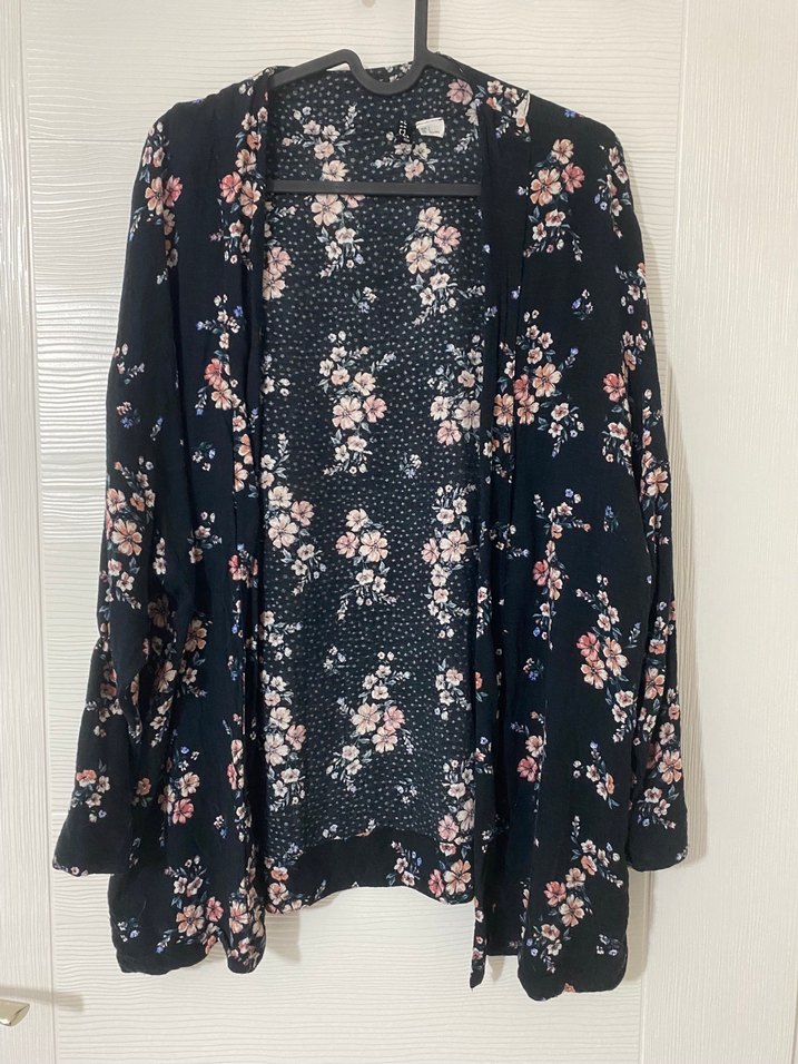 Çiçek desenli, uzun kollu siyah kimono. Salaş kesim, drapeli tasarım ve V yaka detaylarıyla bohem tarzını yansıtıyor. Yumuşak sentetik kumaştan, günlük kullanıma uygun.