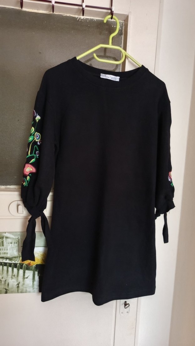 Siyah çiçek desenli nakışlı kollara sahiptir. Salaş kesimi ve yuvarlak yakasıyla rahat bir kullanım sunar.