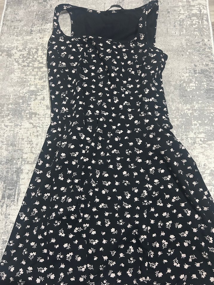 Pamuk kumaştan, çiçek desenli siyah mini elbise. Oturan kesim ve drapeli detaylar içerir, gotik ve Paris tarzını yansıtır.