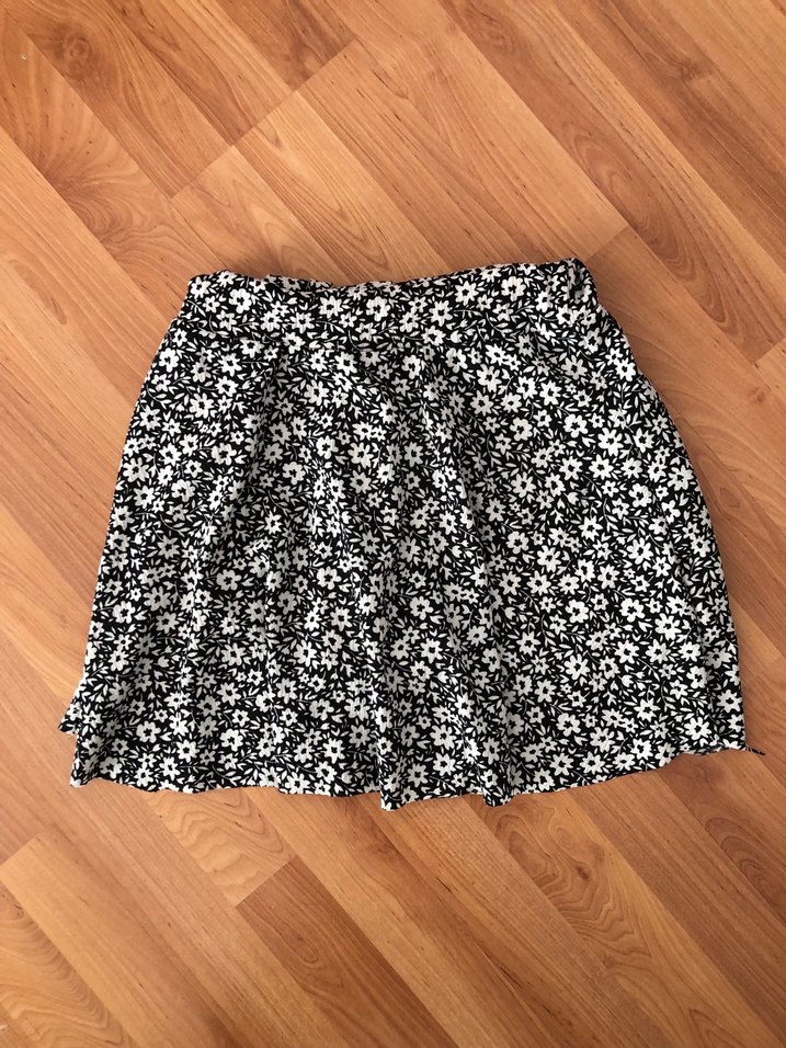 Rahat kesim, fırfırlı detaylı siyah-beyaz çiçek desenli mini etek. Yumuşak sentetik kumaştan, açık hava kullanımı için uygun. Kendinden şortludur. Hiçbir hasar kusuru yoktur. Mağazadan yeni alınmış kalitedir.
