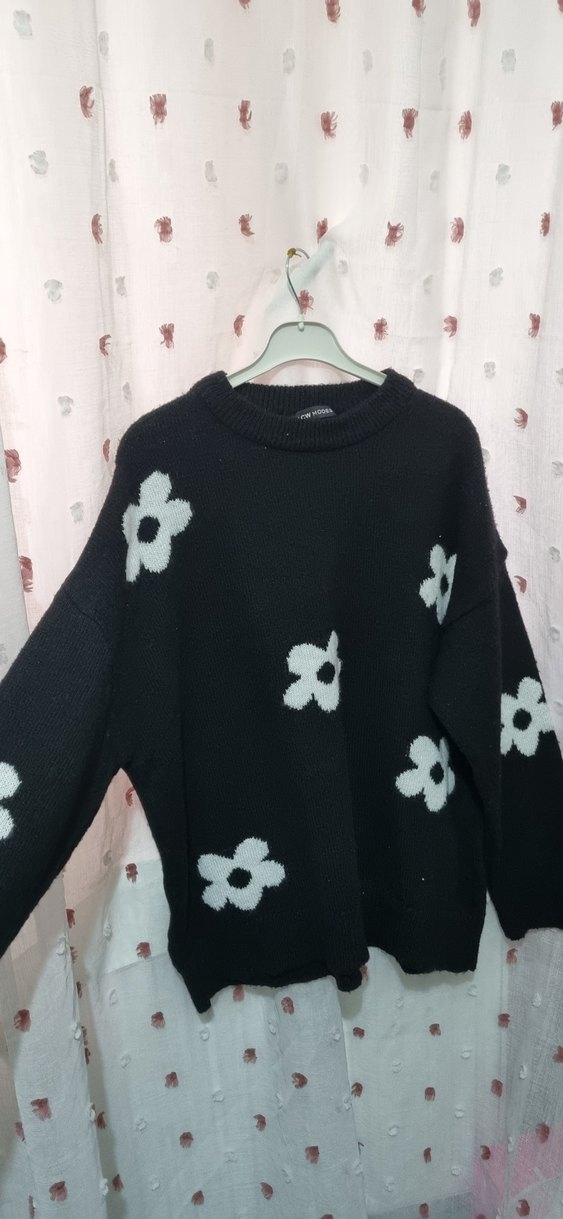 Siyah renkli, çiçek desenli örgü kadın kazak. Uzun kollu, yuvarlak yaka ve rahat kesimlidir. Günlük kullanıma uygundur. M beden ama dar kesim değil bol ve rahat L beden gibi yani