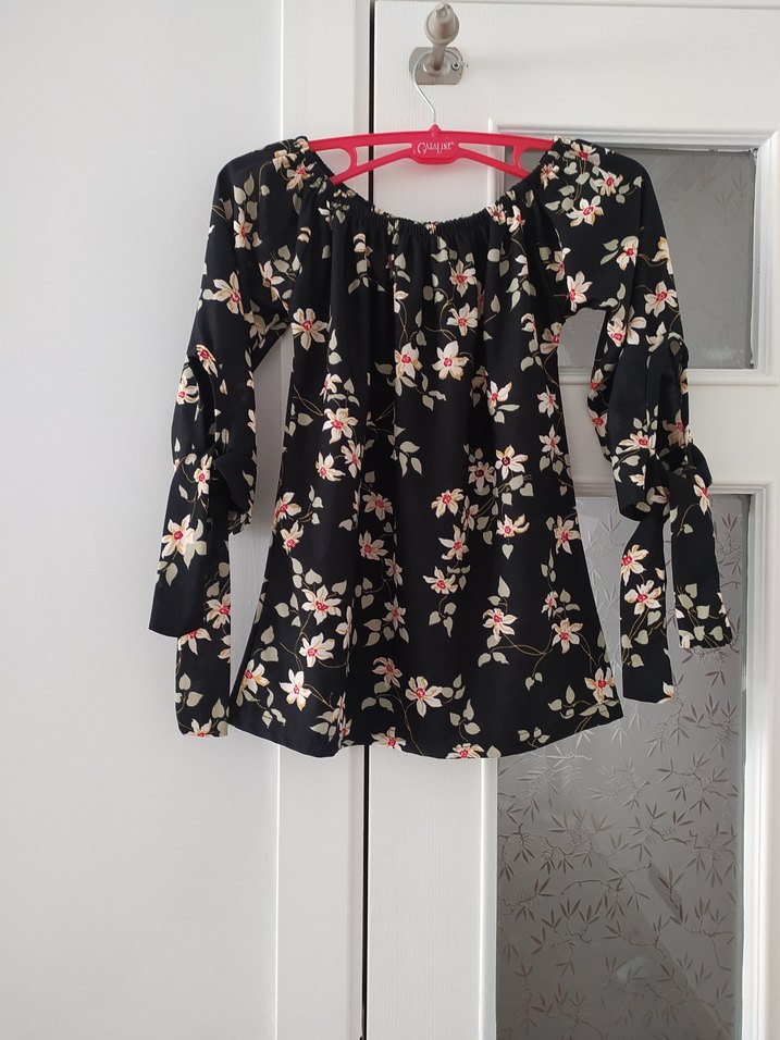 Çiçek desenli, straplez, uzun kollu ve fırfırlı detaylara sahip bol kesim mini bluz. Yumuşak sentetik kumaştan, bohem tarzda.