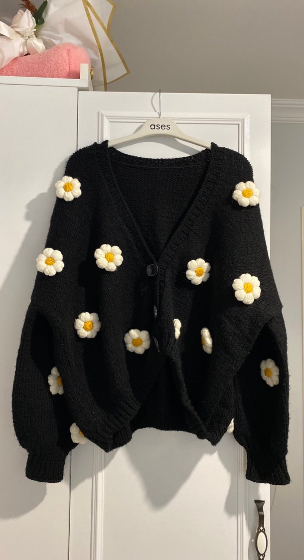Siyah triko hırka, beyaz çiçek desenleri, bol kesim ve uzun kollu, rahat bohem tarz için uygun. El örmesidir