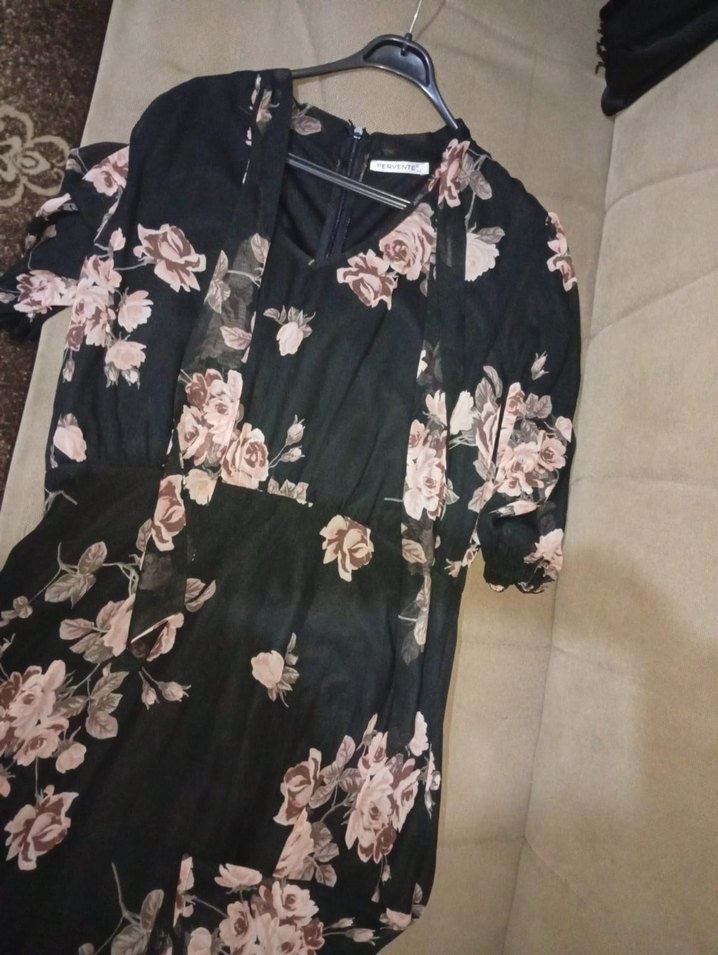 Siyah uzun elbise, çiçek desenli, drapeli ve askılı kollu, V yakalı, bol kesim bohem tarzı günlük kullanım için uygundur.