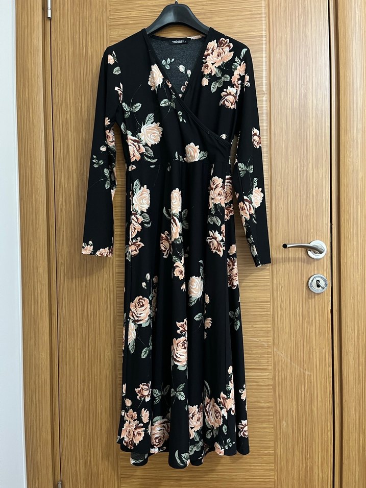Siyah zemin üzerine çiçek desenli, uzun kollu, bol kesim ve drapeli V yaka bohem tarzda uzun elbise. Günlük kullanıma uygundur.