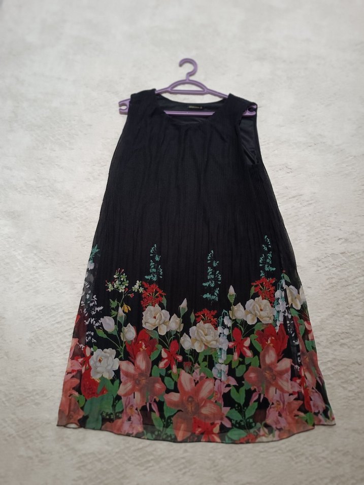 Kolsuz, uzun siyah elbise, bol kesim ve pile detaylıdır. Etek kısmında canlı çiçek desenleriyle bohem tarzını yansıtır.