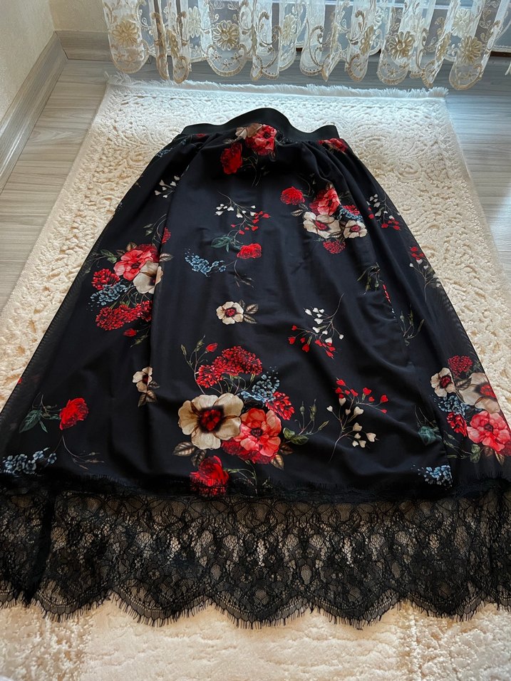 Siyah, çiçek desenli, bol kesim ve drapeli uzun etek. Sentetik kumaştan olup, dantel etek ucu detayına sahiptir. Romantik buluşmalar için uygundur.