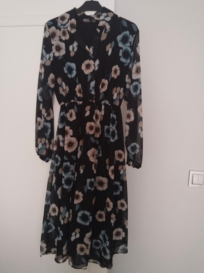 Siyah uzun elbise, çiçek desenli, uzun kollu ve V yakalıdır. Düğmeli ön kısmı ve bol kesimiyle bohem tarzı yansıtır.
