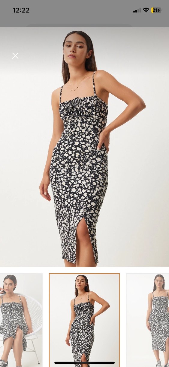 Siyah renkli, ince askılı ve V yakalı bu elbise, drapeli tasarımı ve yırtmaç detayı ile romantik akşamlar için uygundur.