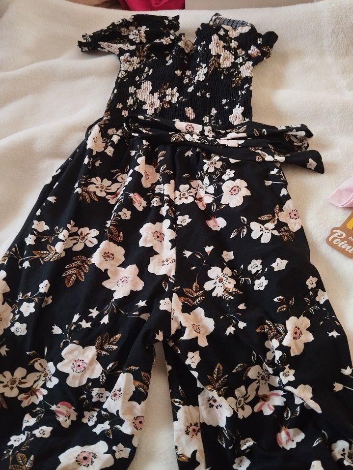 Sentetik kumaştan, bol kesim ve askısız yakalı uzun kadın tulumu. Koyu renkli çiçek desenli, bohem tarzda, tokalı detaylı, günlük kullanım için uygundur.