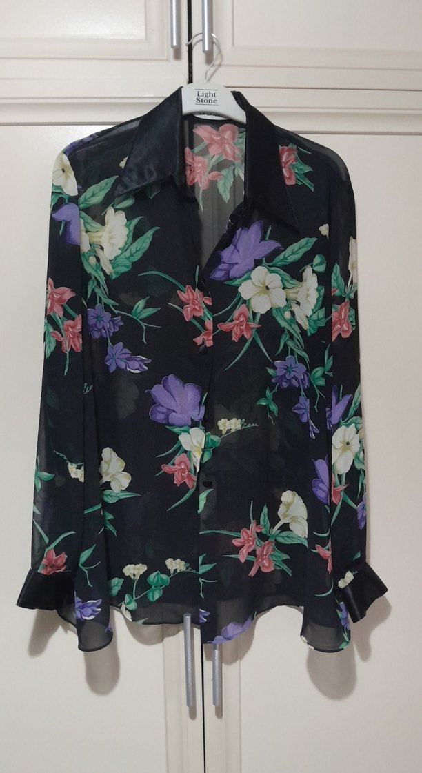 Siyah zemin üzerine çok renkli çiçek desenli, uzun kollu, yakalı ve düğmeli, bol kesim sentetik kumaştan tül gömlek. vintage ve goth tarzlarına uygundur.