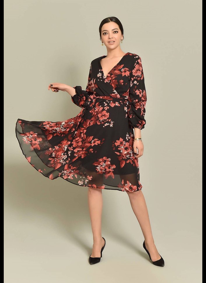 Çiçek Desenli Siyah Uzun Kollu V Yaka Elbise
