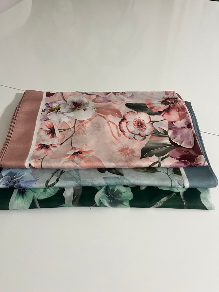Kadınlar için çok renkli, çiçek desenli ve dökümlü tasarıma sahip sentetik kumaştan fular. Bohem tarzı yansıtıyor.