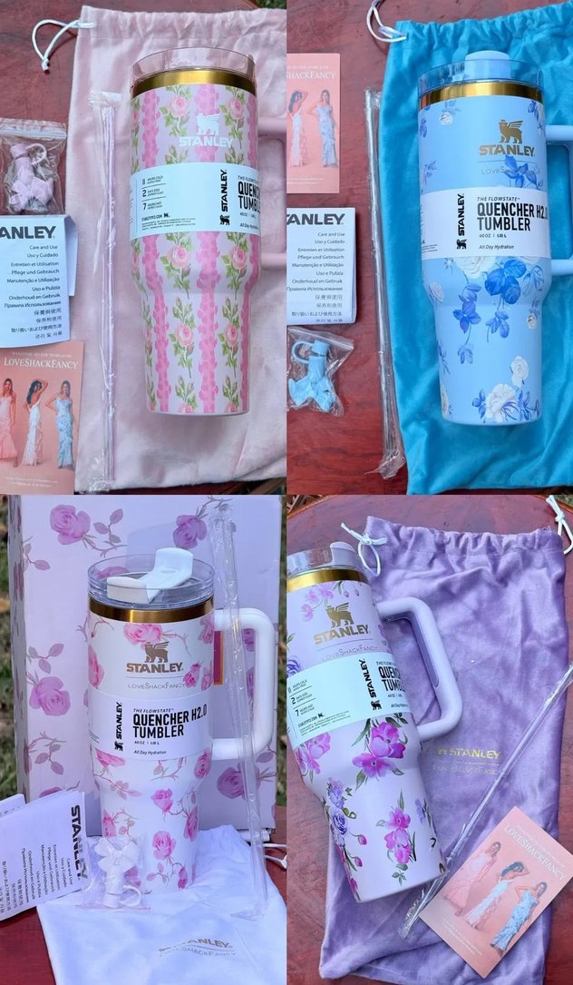 Stanley Quencher H2.0 Tumbler, çiçek desenli pastel renklerde, taşınabilir tutma sapı ve koruyucu kumaş kılıf ile birlikte gelir.