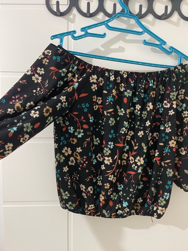 Çiçek desenli, straplez, bol kesim ve düğmeli detaylı bluz. Karanlık tonlarda çok renkli, açık hava kullanımı için uygun.