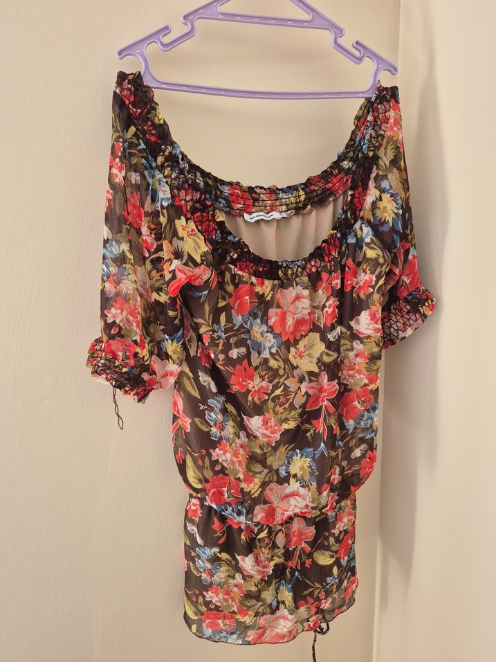 Sentetik kumaştan, çiçek desenli, straplez, bol kesim mini bluz. Drapeli ve askılı kollarıyla bohem tarzı yansıtıyor.